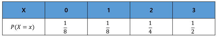 E(X) = X * P(X)의 합계 = 0*1/8 + 1*1/8 + 2*1/4 + 3*1/2 = 17/8 = 2.125