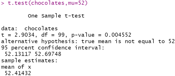 ② 귀무가설을 기각하여 초콜릿의 무게가 52g이 아니라고 할 수 있다.