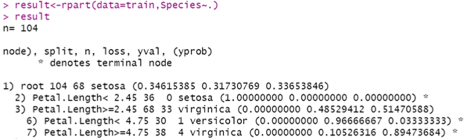 - 2번 자식마디는 36개 setosa 중 0개가 잘못 분류되었으며 자식마디가 없음.