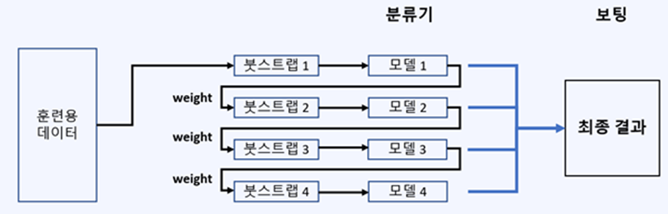 ㅇ 부스팅 : 배깅과 유사한 이전 모델에서 잘못 분류된 데이터에 더 큰 가중치를 주어 새로운 붓스트랩을 구성한다는 점에서 다르다. 약한 분류기들을 결합하여 강한 분류기들을 생성하는 방법이다. (ex. AdaBoosting, Gradient Boost, XGBoost, Light GBM 등) 배깅보다 높은 정확도를 보유하지만 과적합될 가능성이 있으며 이상값에 민감한 단점이 있다.