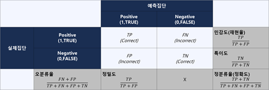 - 오분류표 : 혼동행렬이라고 분리며 두 개의 집단을 분류하는 이진분류 모형에 대한 성과평가를 위한 표이다.
