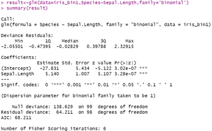 - 추정되는 회귀식은 ln(Odds) = -27.831 + 5.140 X Sepal.Length 이다.